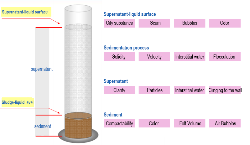 | Supernatant superficies - Odor | Odor emissus (in initiali sedendo) | 1. Fortis terrenus (musty) odor indicat altum biologicum activitatem 2. Fortis acidic vel alkaline odor indicat liquor mixta abnormis pH Fortis odoris 3. suggerit oxygeni defectus 4. Alios odores insolitos influere possunt aquae vastae industrialis specificae. |