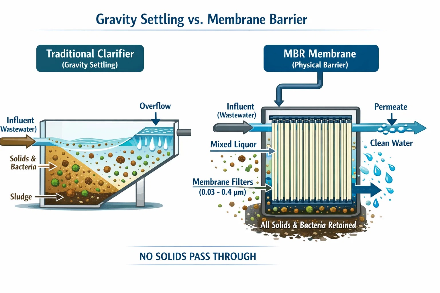 In planta conventionali limitata es quam celeriter particula mergi possit. In MBR, utimur a membrana corporis obice (typice 0.03 ad 0.4 µm).
